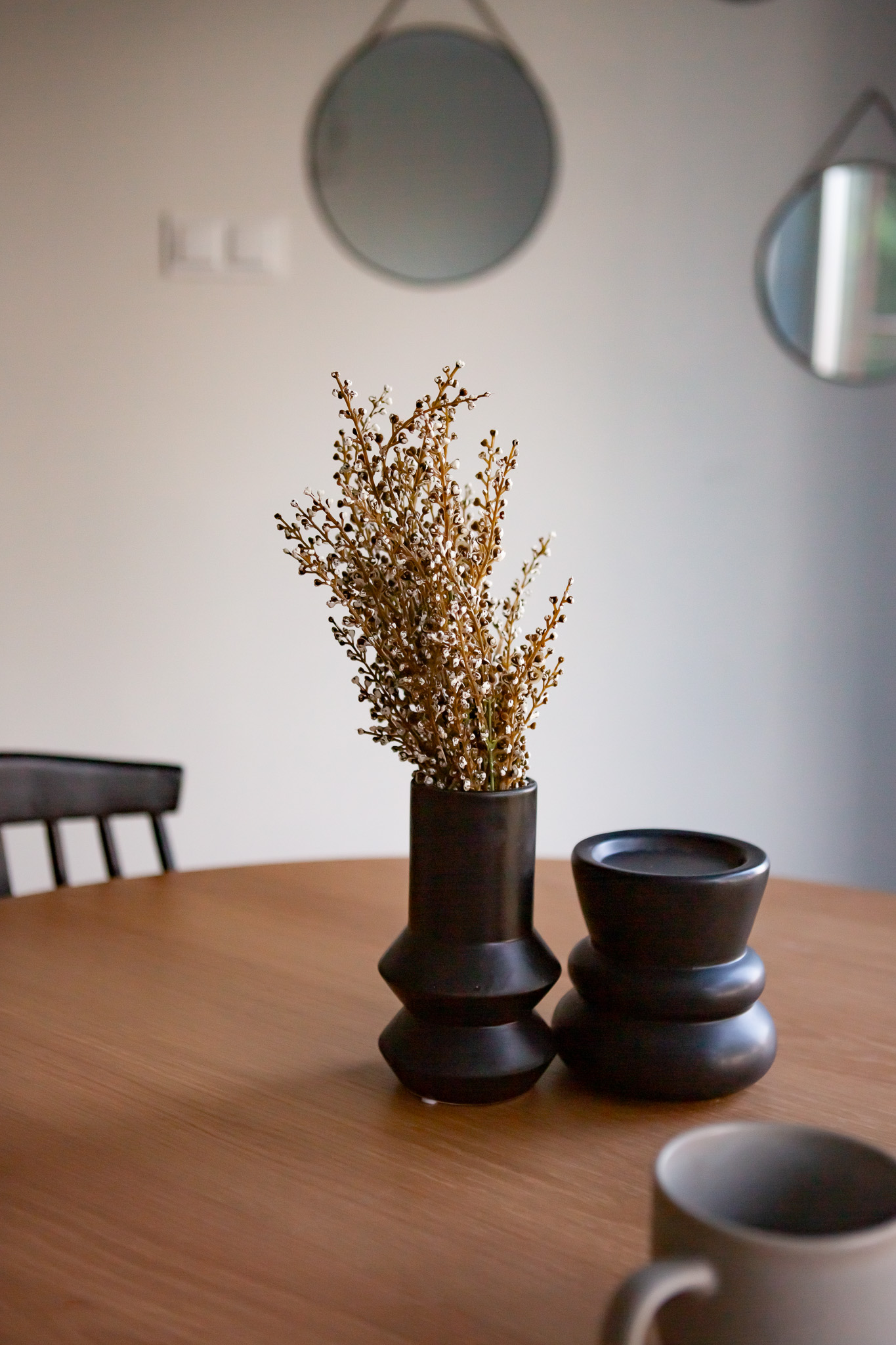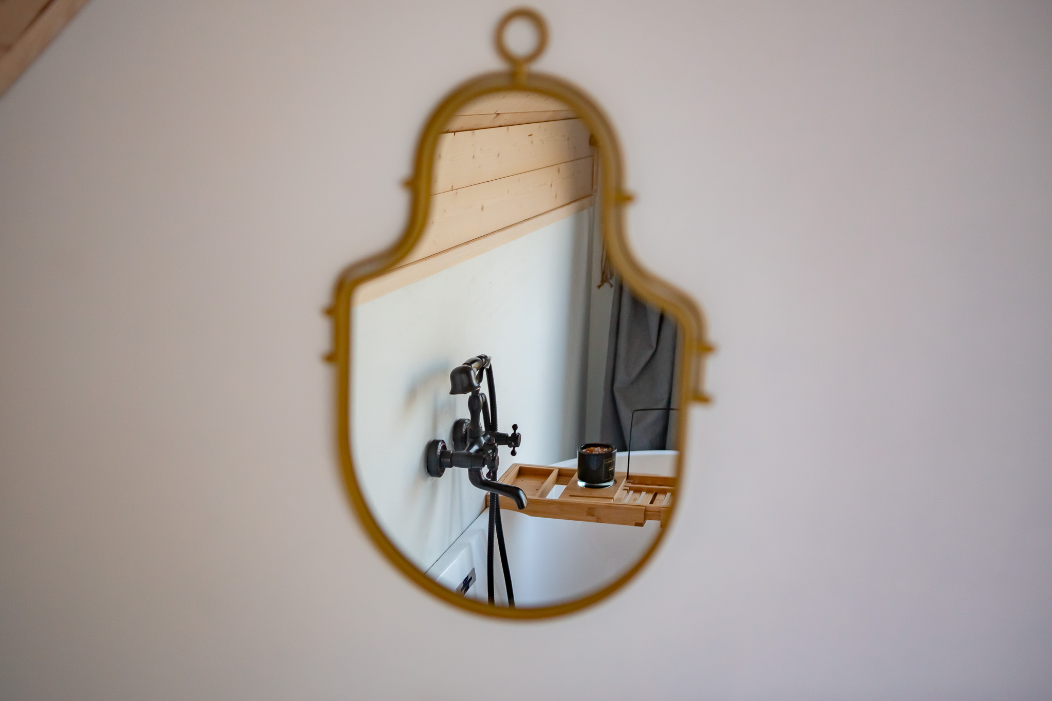 W tym domku zadbaliśmy również o dodatki : naczynia z kamionki, kawiarkę, czajnik w stylu vintage, ozdobne poduszki, ogrom świec, młynek do kawy pochodzące z czasów PRL’u.