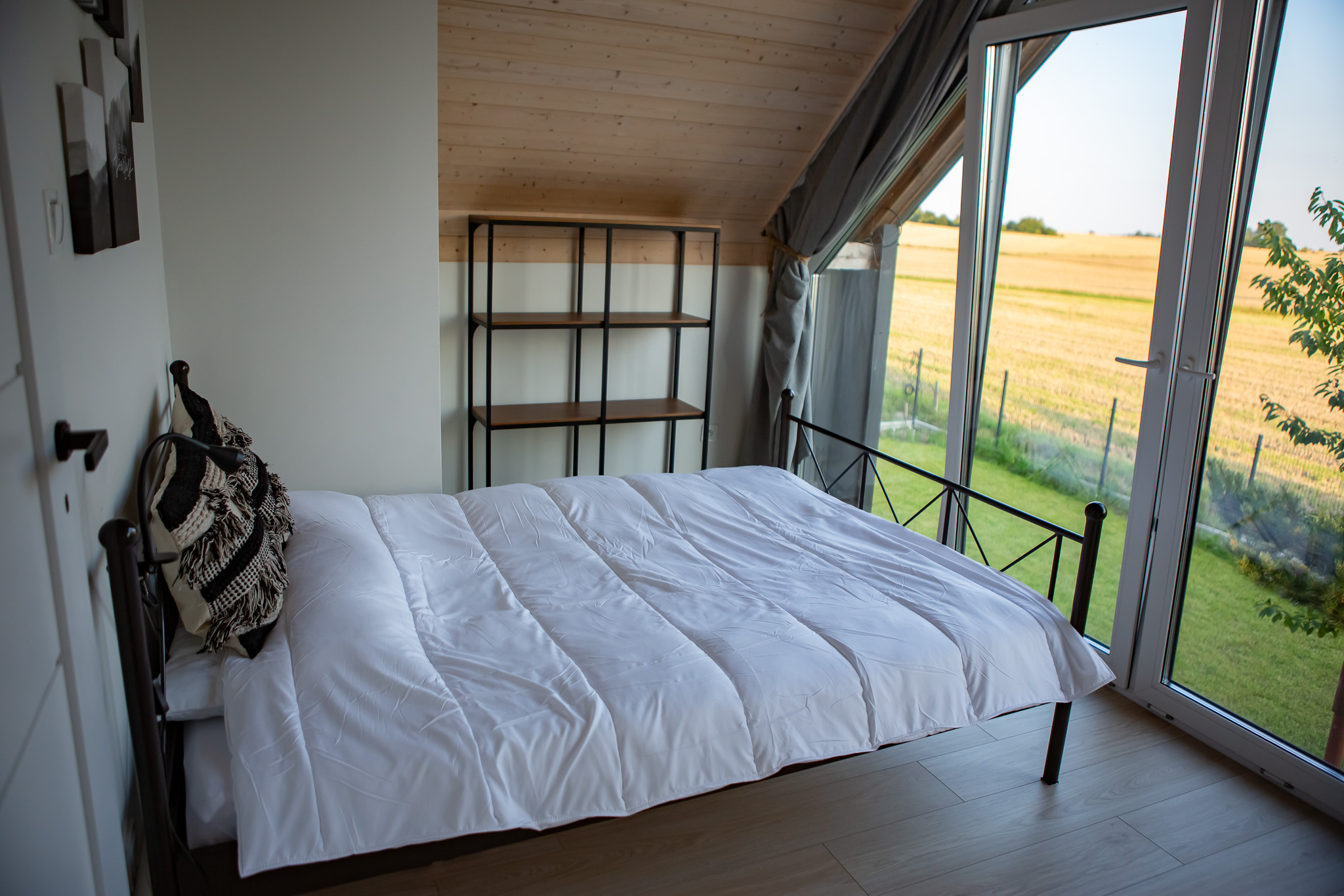 Sypialnie oraz salon mają wielkie, panoramiczne okna, przez które z jednej strony można oglądać zwierzęta buszujące wśród zbóż i wiatr hulający po polach , z drugiej las i ogród. Jeśli jednak chcecie sobie pospać do południa to zasłony typu blackout Wam to umożliwią 🙂